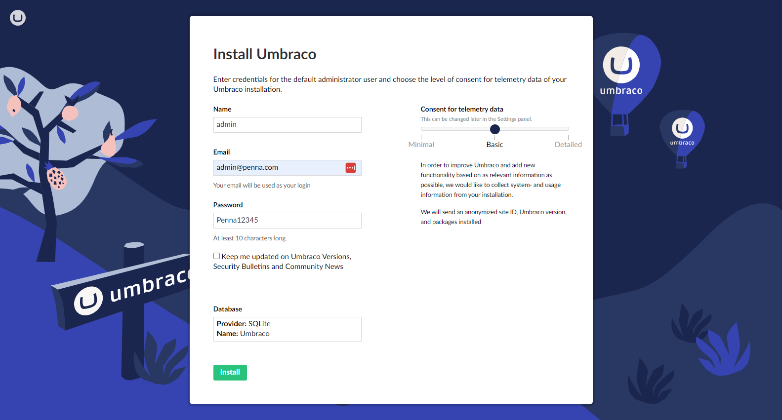The installation process will now run and then the site will open up into the Umbraco CMS.